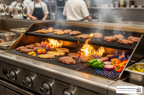 Commercial gas grills heat up to 500°F in under 10 minutes, allowing chefs to sear steaks with perfect grill marks while a flat top handles pancakes for the morning rush. They are built with stronger, more durable parts to resist corrosion in harsh kitchen environments and withstand thousands of cooking cycles. This guide will walk you through everything you need to know before investing in a commercial gas grill. You'll learn the differences between charbroilers and griddles, what BTU ratings mean for your kitchen, and which features deliver real value.