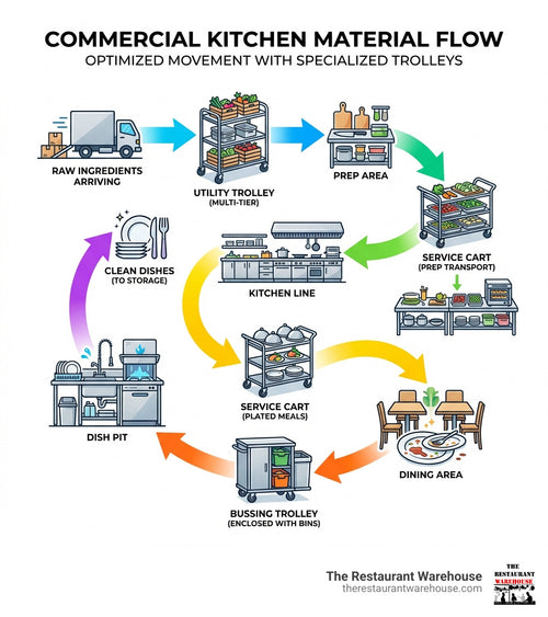 Walk into any bustling restaurant kitchen during peak service, and you'll witness a carefully choreographed dance of activity. Amidst the sizzle of the grill and the calls of the expediter, you'll see them everywhere—gleaming stainless steel carts gliding between the prep station and the line, sturdy plastic bins rolling silently towards the dish pit, and tall racking trolleys loaded with sheet pans waiting to enter or exit the ovens. These workhorses might not be glamorous, but they are the logistical backbone of any successful culinary operation. Industry data reveals a vast market with over 111 different commercial kitchen trolley products available from 27 manufacturers, with options ranging from simple 3-tier utility carts to specialized 30-tier gastronorm pan racks.