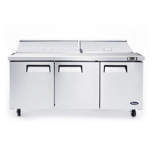 Atosa SKU MSF8304 72 inch Sandwich/Salad Top Refrigerator, Atosa MSF8304 72 inch Sandwich/ salad prep refrigerator efficient refrigeration system, three-section, 72-7/10″W x 30″D x 44-3/10″H, accessories (18) 1/6 stainless steel pans, rear-mounted compared to pizza prep table side mount compressor unit, self-contained refrigeration, 21.1 cu. Ft., (3) solid hinged door handle self-closing doors, digital temperature control, 33° to 40°F temperature range, (3) adjustable shelves, 10″ poly cutting board, ventilated refrigeration, automatic evaporation, air defrost, stainless steel interior & exterior, galvanized steel back, 5″ casters, R290 Hydrocarbon refrigerant, 1/5 HP, 115v/60/1-ph, 2.8 amps, cord, NEMA 5-15P, cETLus, ETL-Sanitation.