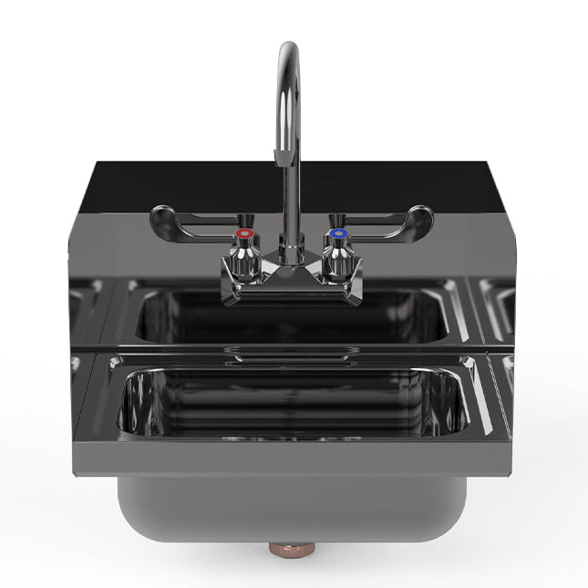 With overall dimensions of 17"W × 15-3/8"D × 13-1/4"H, this sink fits efficiently into most kitchen layouts while providing ample workspace. The generously proportioned bowl measures 10"W × 14" front-to-back with a 5" depth, offering sufficient capacity for thorough handwashing and sanitizing. This size strikes the perfect balance between functionality and space efficiency, making it ideal for both compact kitchens and larger food service operations.