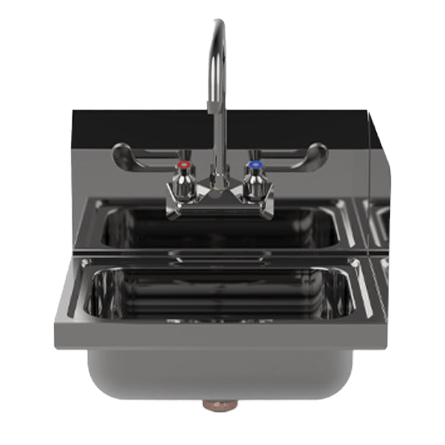Hand sink, wall-mount, 20 ga 304 stainless steel, 17"W × 15-3/8"D × 13-1/4"H overall, 10"W × 14" front-to-back × 5" deep bowl, 6" backsplash with 2" return, gooseneck faucet with wrist-blade handles, 1-1/2" waste drain & strainer, Z-clip mounting bracket, NSF.