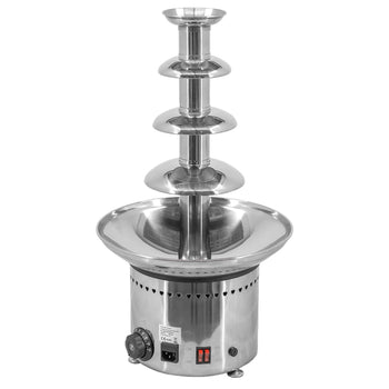 This 4-tier stainless steel chocolate fountain features an 8.8-pound chocolate capacity and adjustable temperature control for precise melting and flow. Constructed with polished stainless steel, it combines durability with an elegant appearance. Operating at 200 watts with a 110-120V/60Hz power supply and equipped with a NEMA 5-15P cord, it ensures reliable performance. Ideal for professional catering and events, this fountain delivers smooth, consistent chocolate cascading across all five tiers for an impressive dessert display.